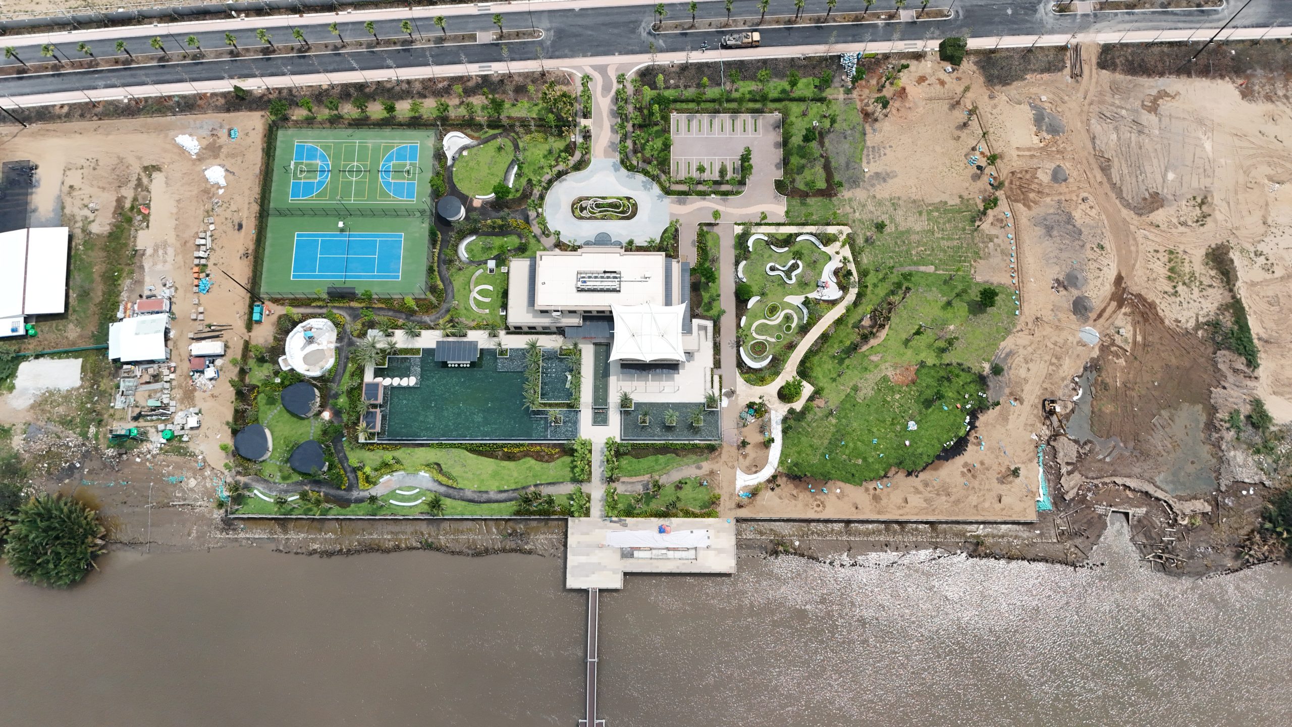Mặt bằng tổng thể được quy hoạch mạch lạc, kết nối bởi trục đường chính chạy dọc đảo, cùng hệ thống công viên ven sông, hồ cảnh quan, quảng trường và tiện ích cộng đồng. Mỗi khu nhà ở được đặt giữa không gian xanh rộng lớn, đảm bảo mật độ xây dựng chỉ khoảng 30%, còn lại dành cho công viên, mặt nước và tiện ích nghỉ dưỡng.
